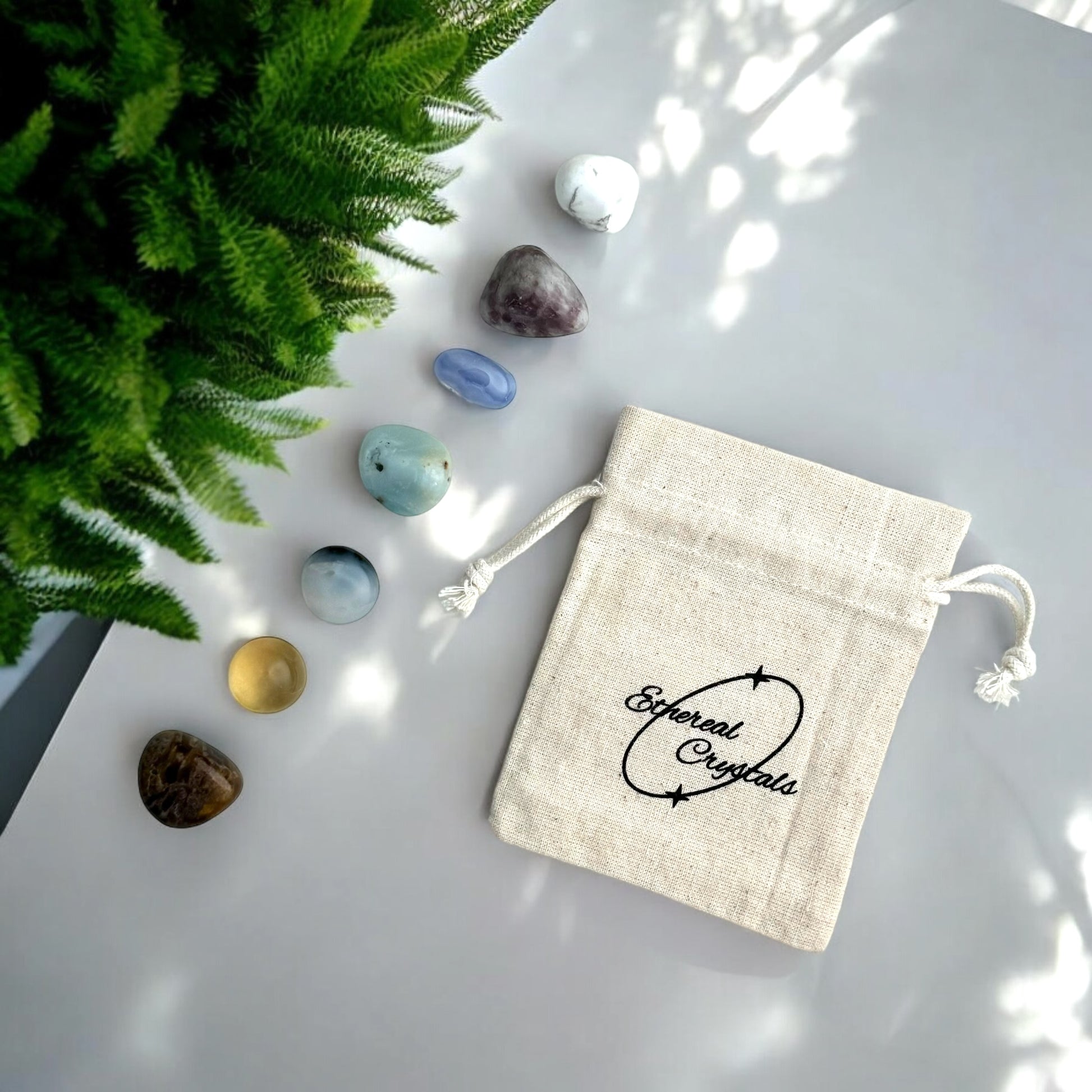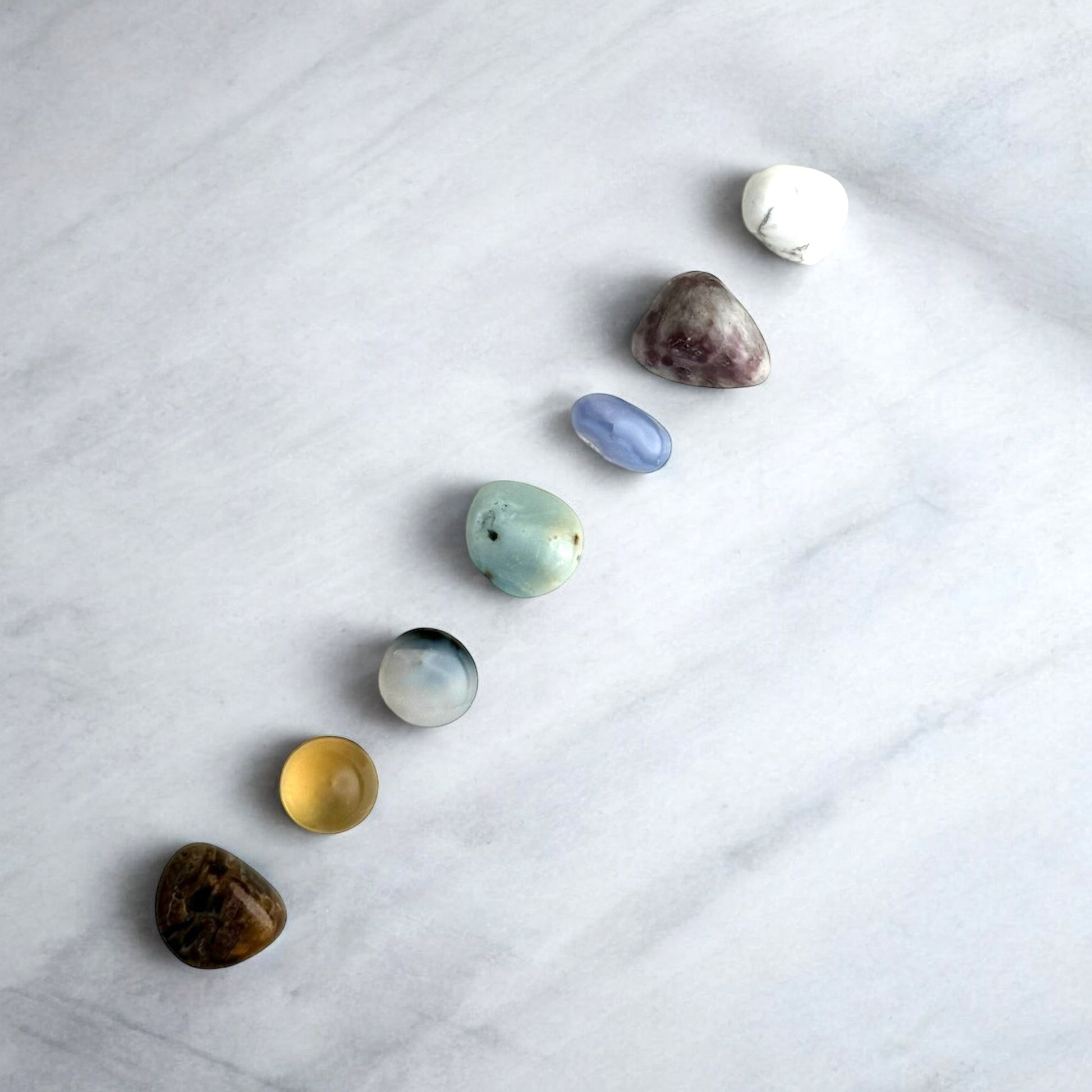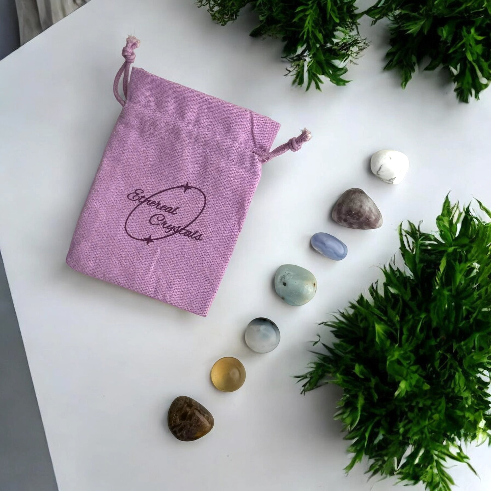 Promote Relaxation and Restful Sleep with Our De-Stress and Sleep Aid Chakra Set expertly crafted to help you unwind, alleviate stress, and enjoy deep, restorative sleep. This set features seven carefully selected crystals, each aligned with a specific chakra to create a calming energy flow throughout your body, supporting relaxation and a peaceful state of mind.