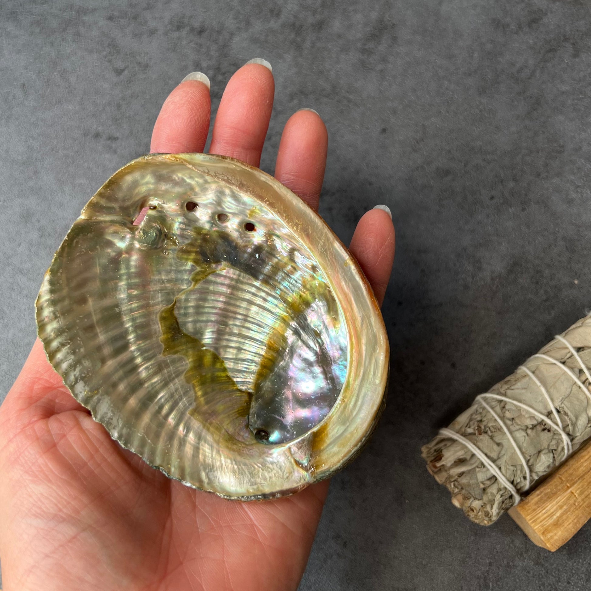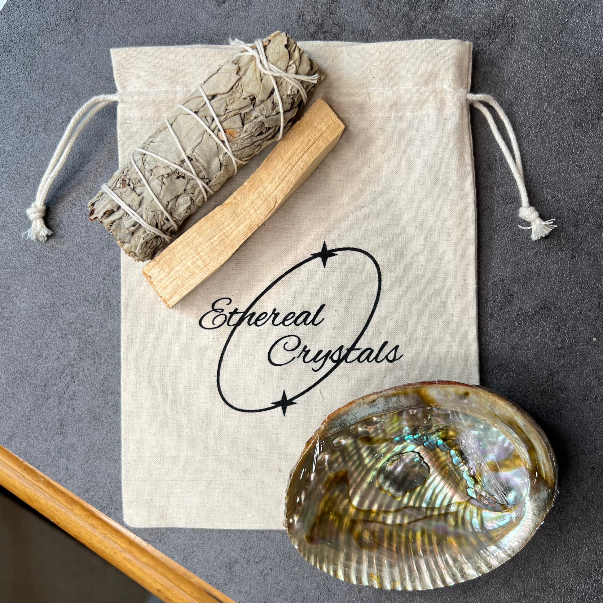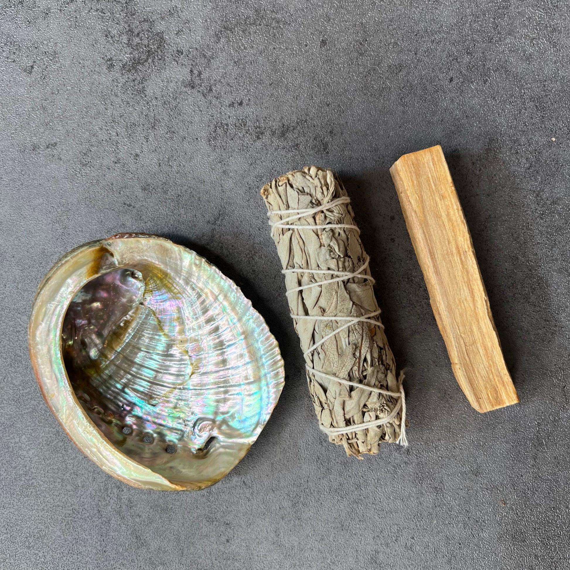 Kit includes: 1 stick of Palo Santo wood Stick, 1 bunch California White sage, 1 small Abalone shell