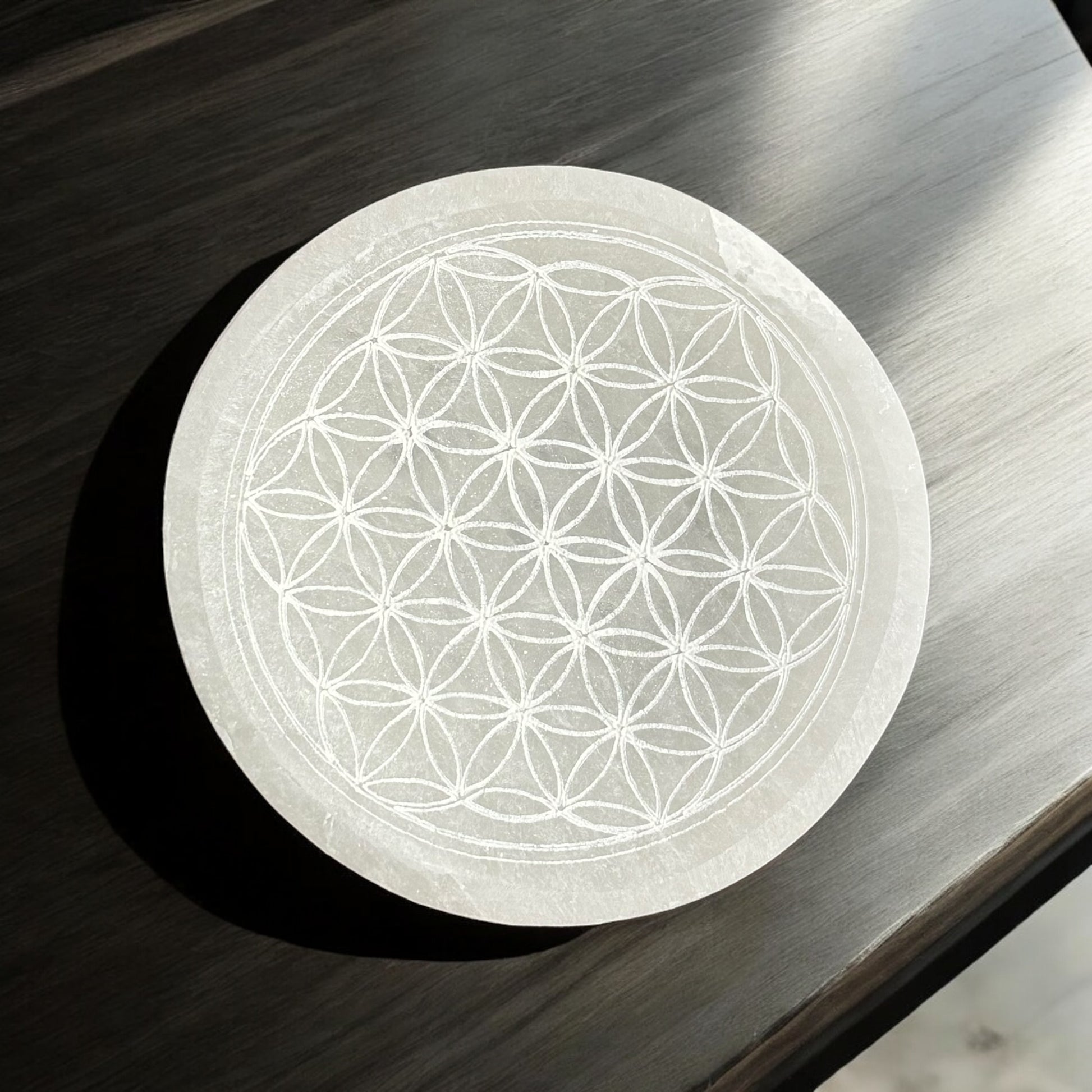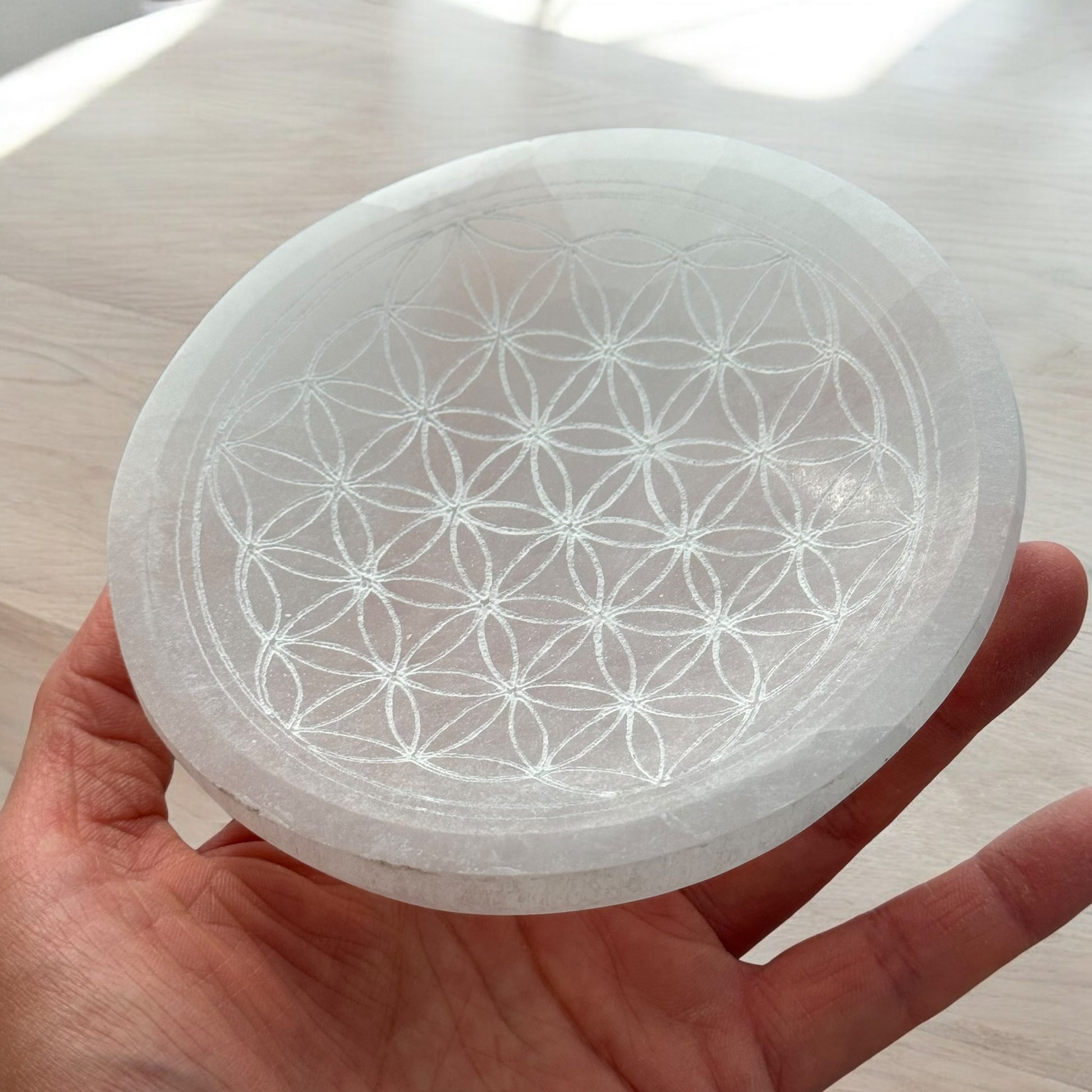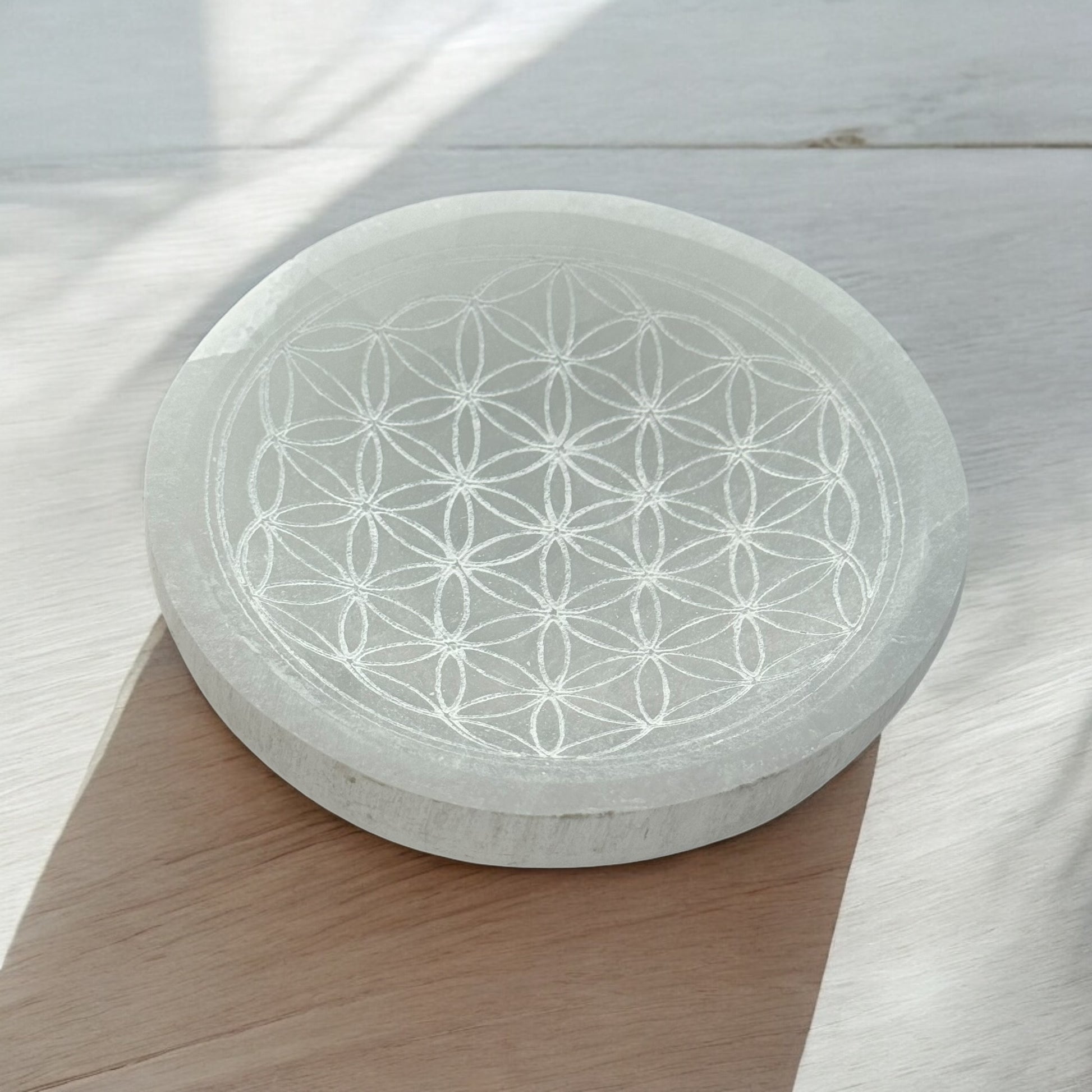 Selenite Bowl, Round, White, With Flower of Life Carving Details