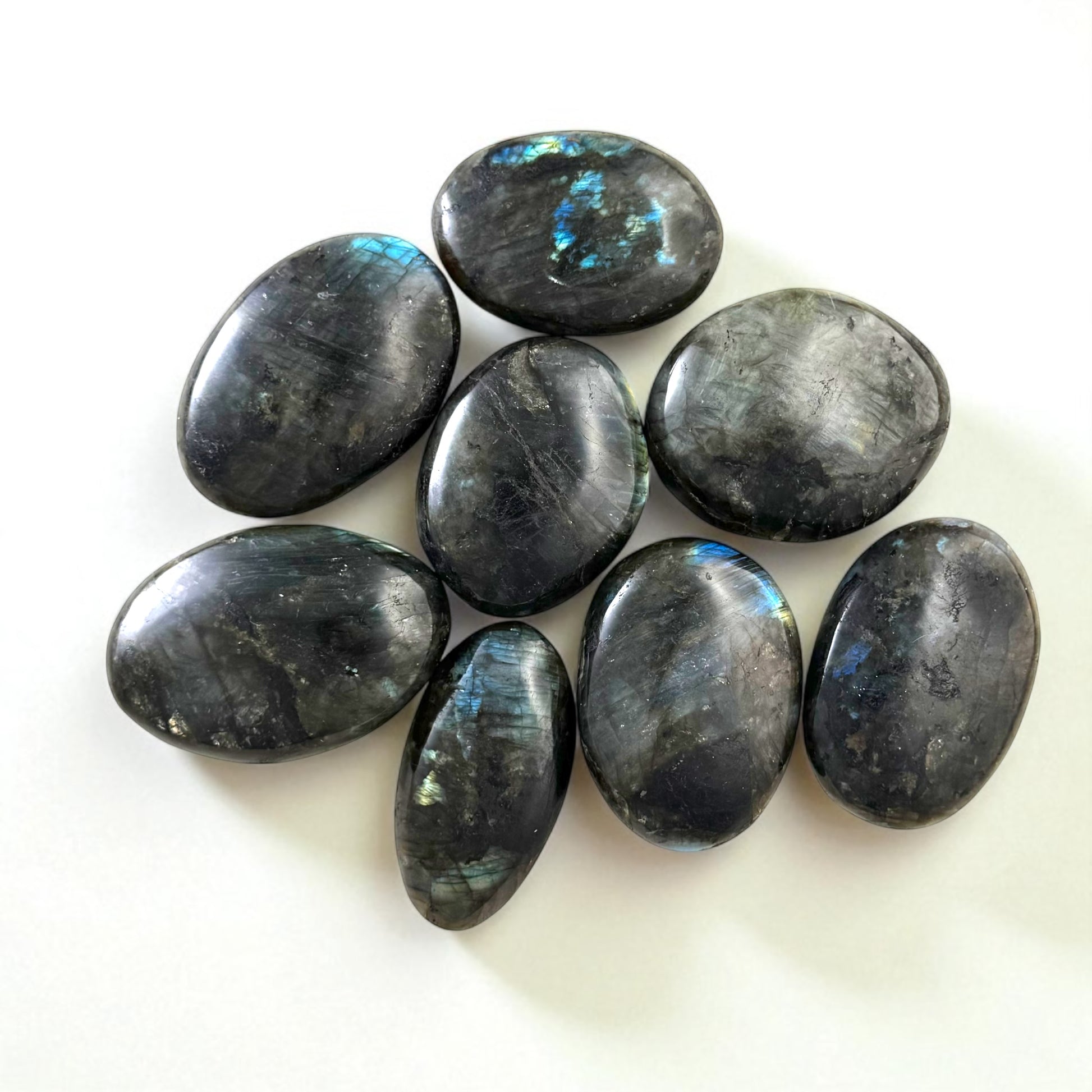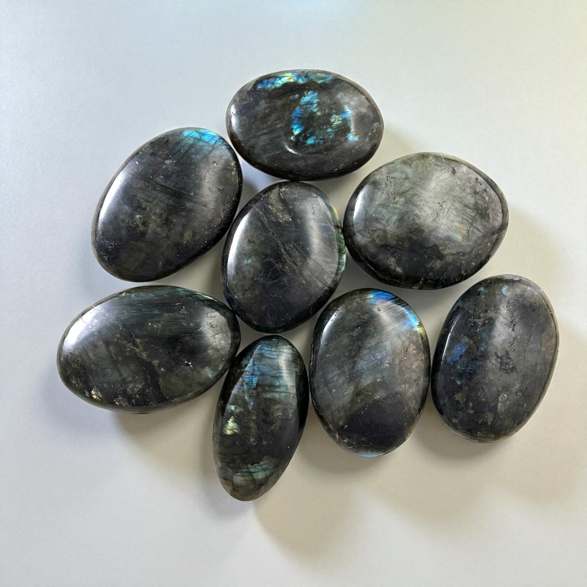 Labradorite is a fascinating and mystical-looking stone known for its remarkable play of color, often displaying blues, greens, and grays with iridescent flashes. Here are some of the commonly attributed healing properties of labradorite, especially when used as a palm stone:
