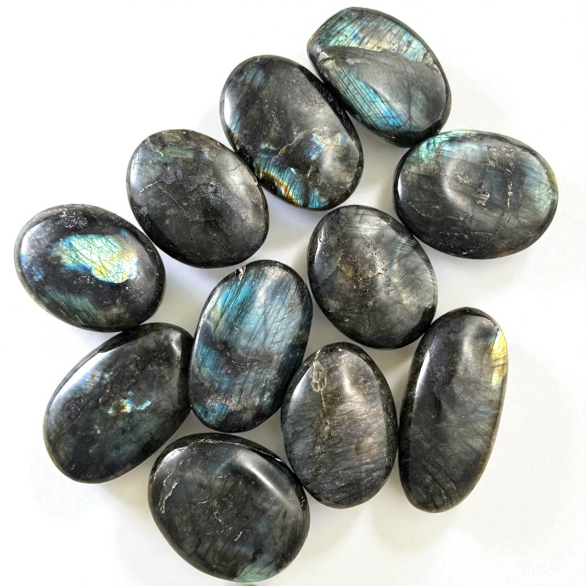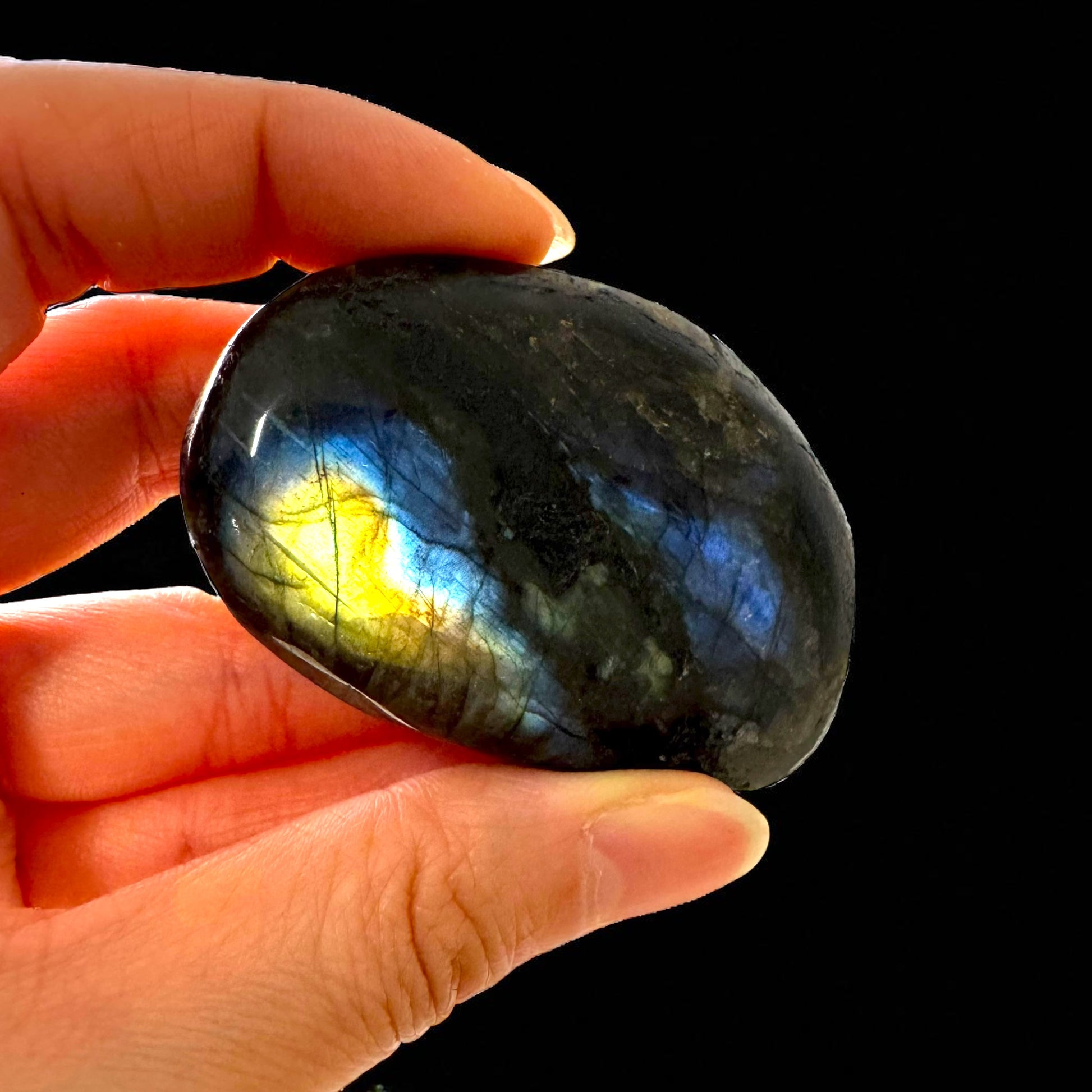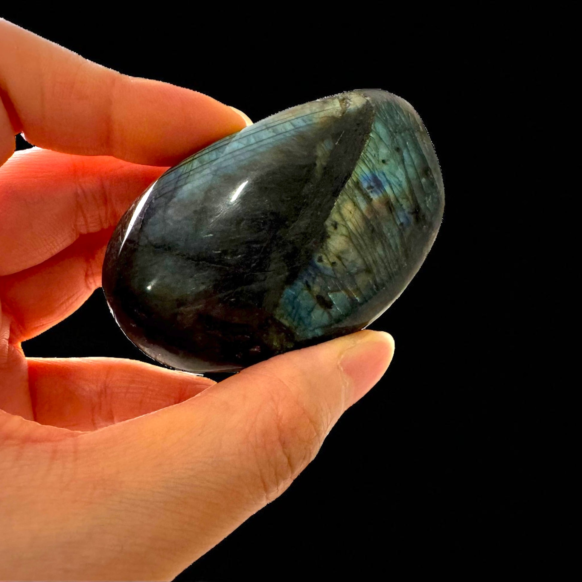 Labradorite is a fascinating and mystical-looking stone known for its remarkable play of color, often displaying blues, greens, and grays with iridescent flashes. Here are some of the commonly attributed healing properties of labradorite, especially when used as a palm stone: