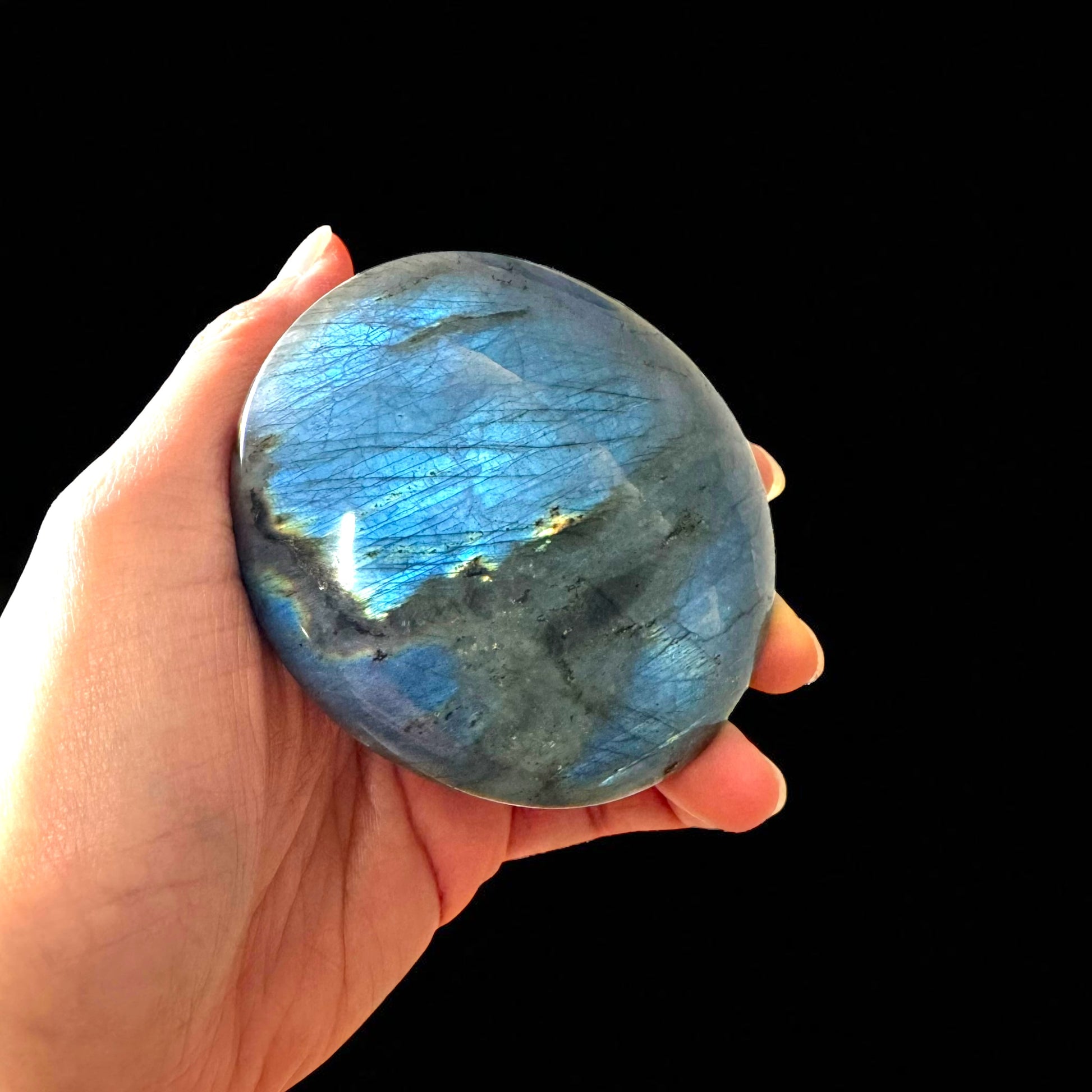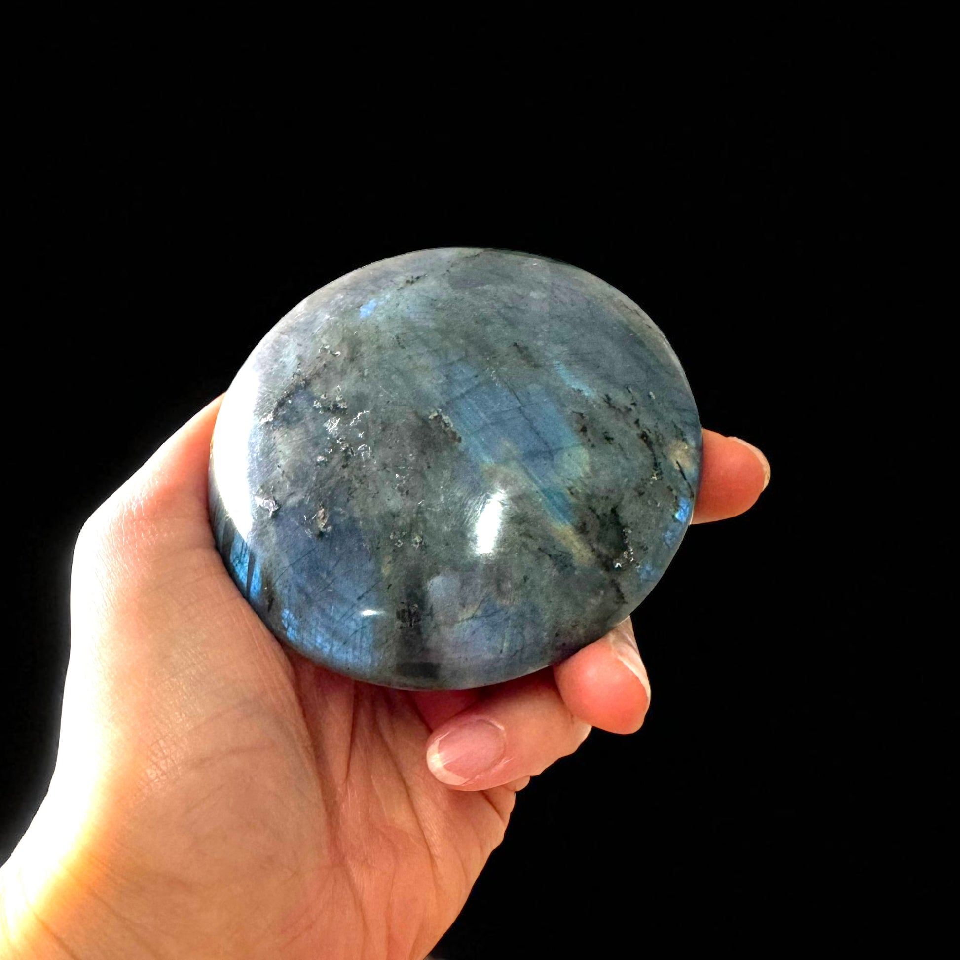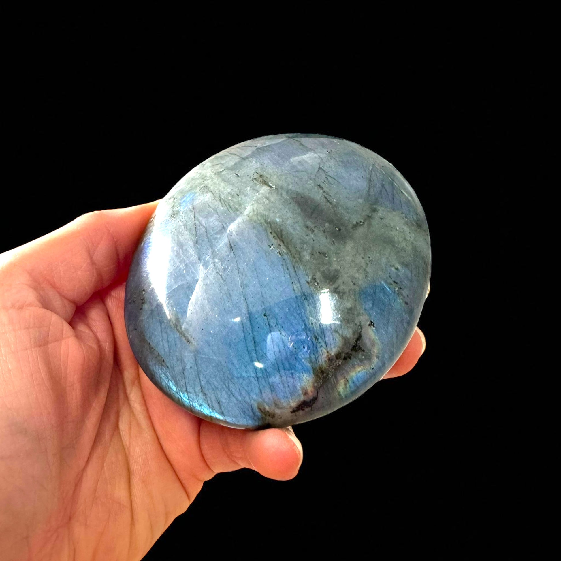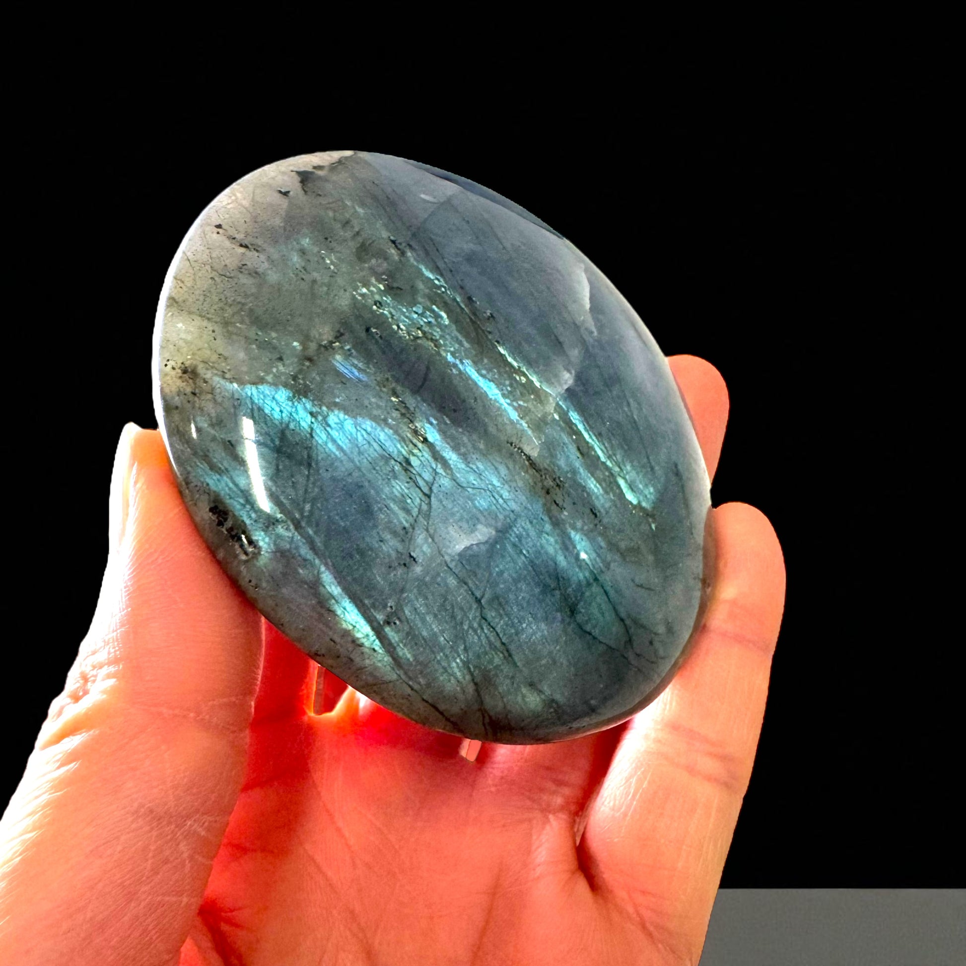 Labradorite is a fascinating and mystical-looking stone known for its remarkable play of color, often displaying blues, greens, and grays with iridescent flashes. Here are some of the commonly attributed healing properties of labradorite, especially when used as a palm stone: