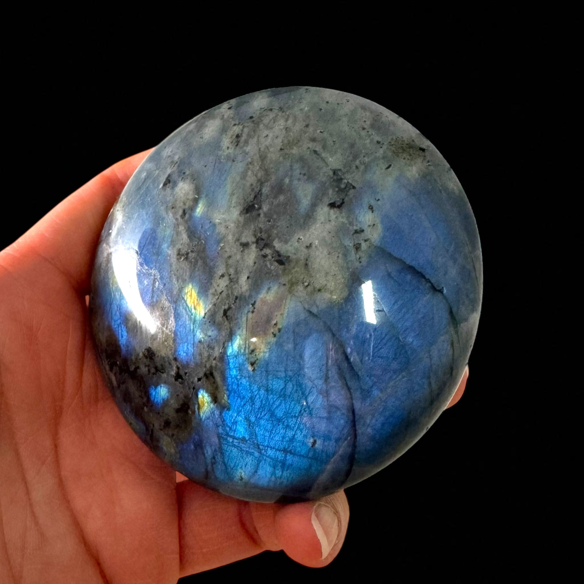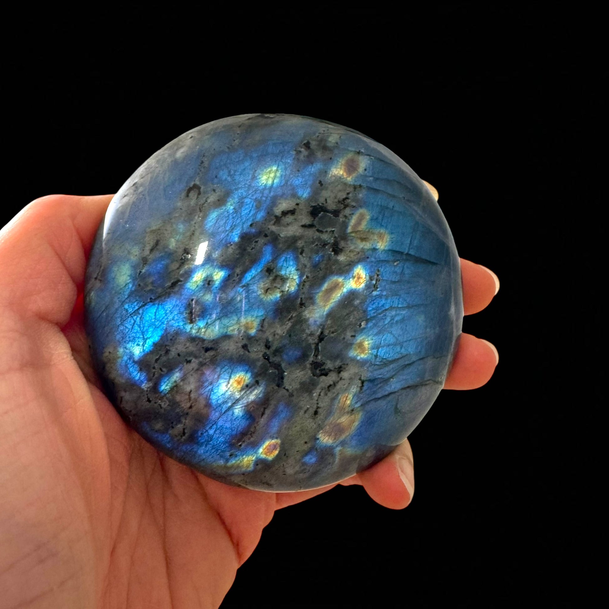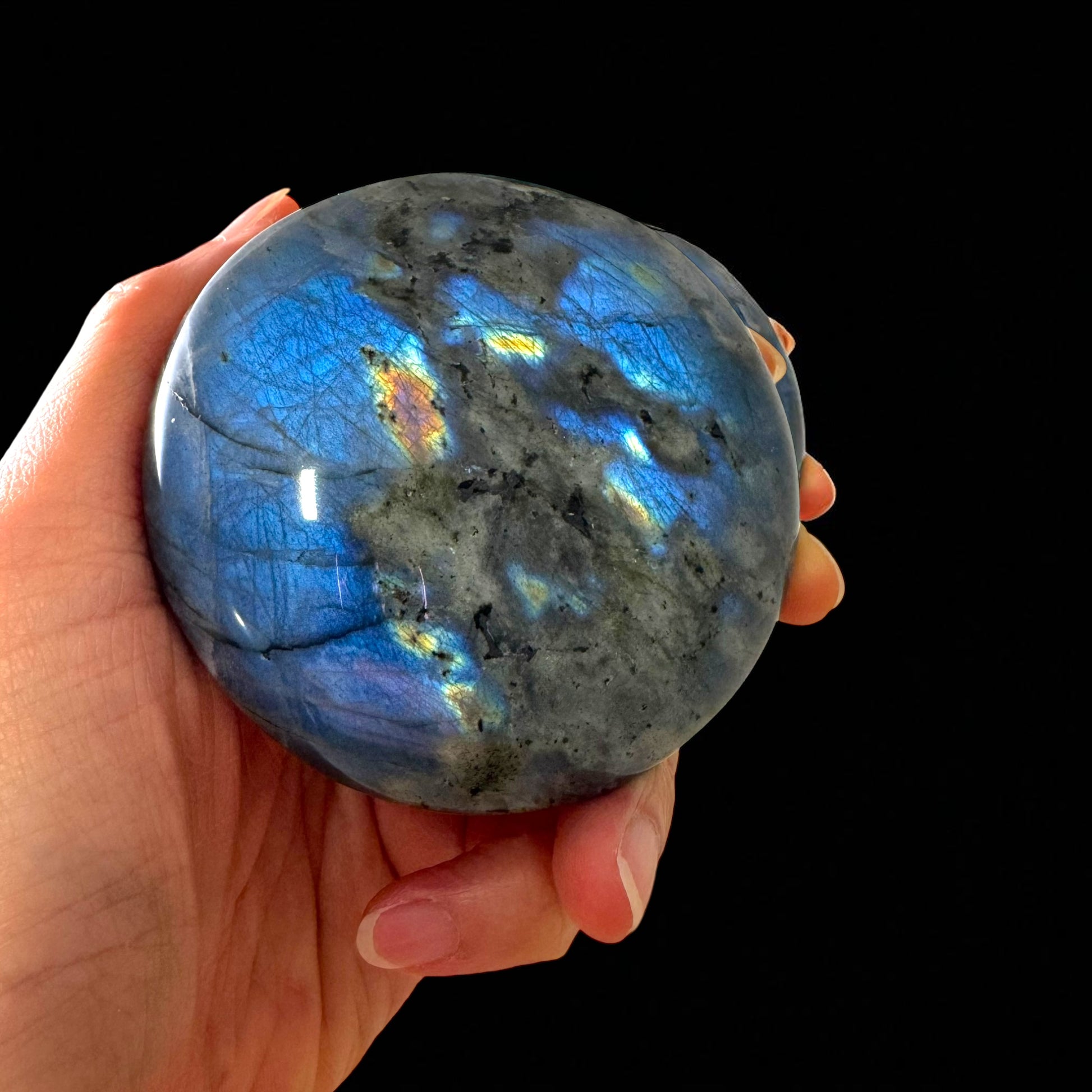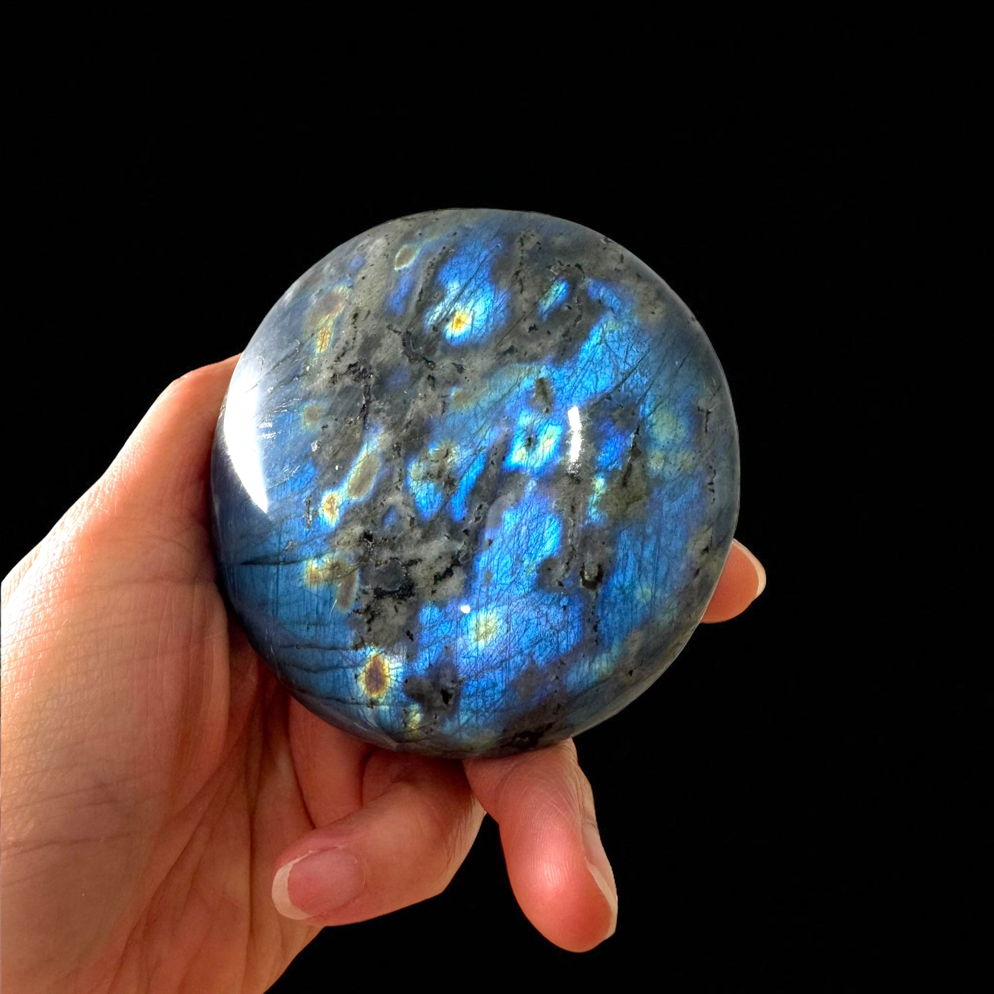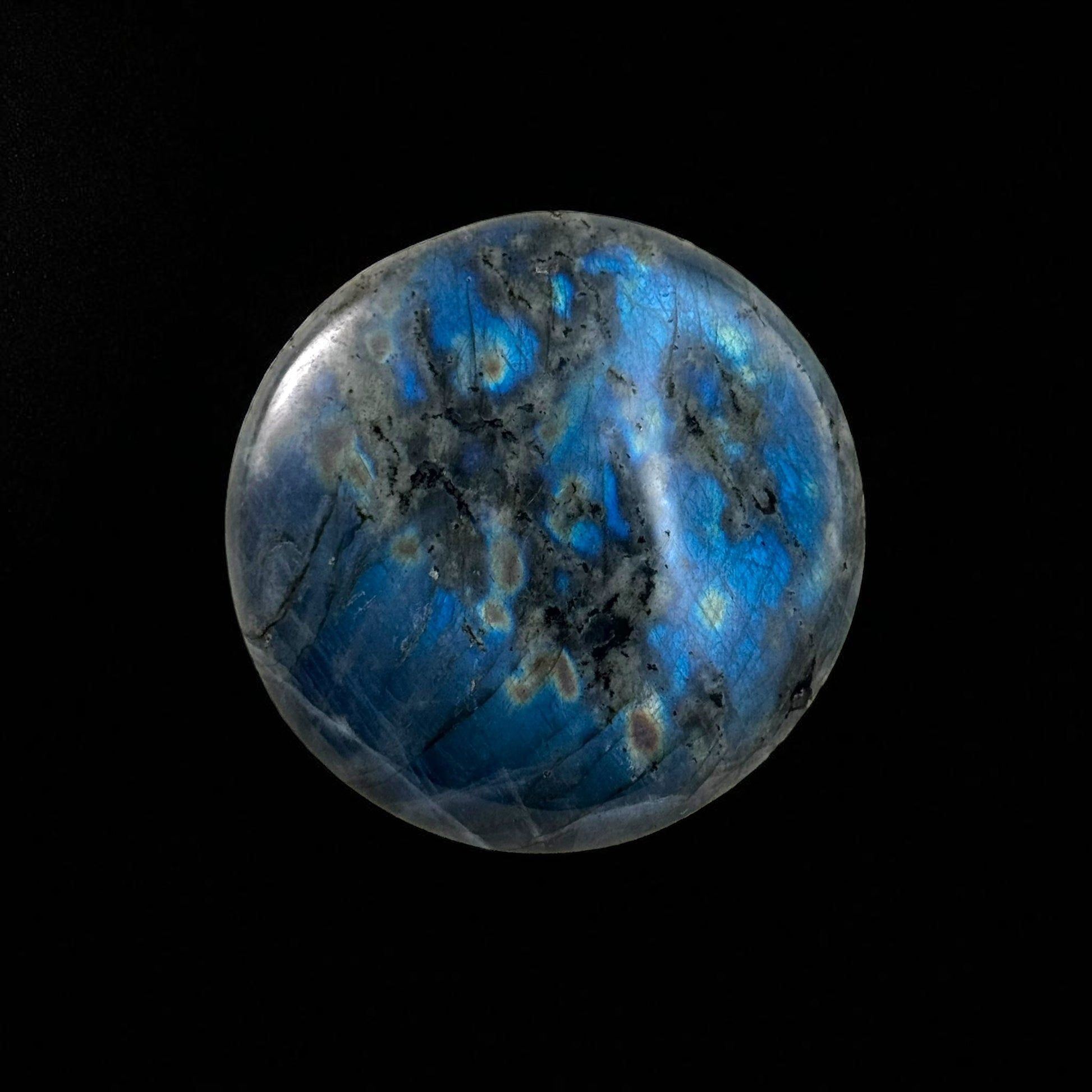 Labradorite is a fascinating and mystical-looking stone known for its remarkable play of color, often displaying blues, greens, and grays with iridescent flashes. Here are some of the commonly attributed healing properties of labradorite, especially when used as a palm stone: