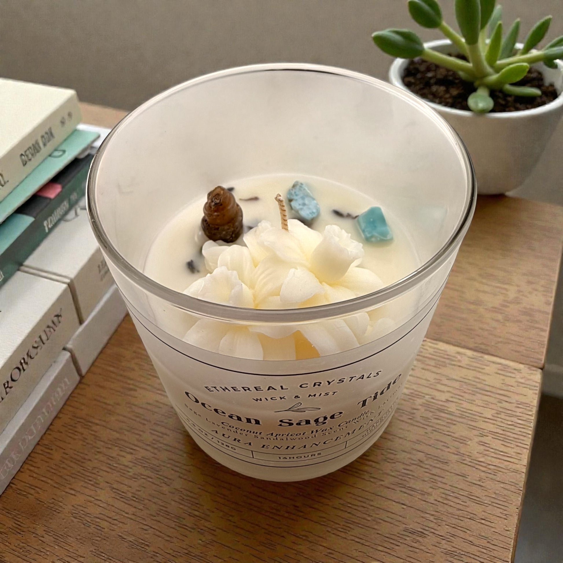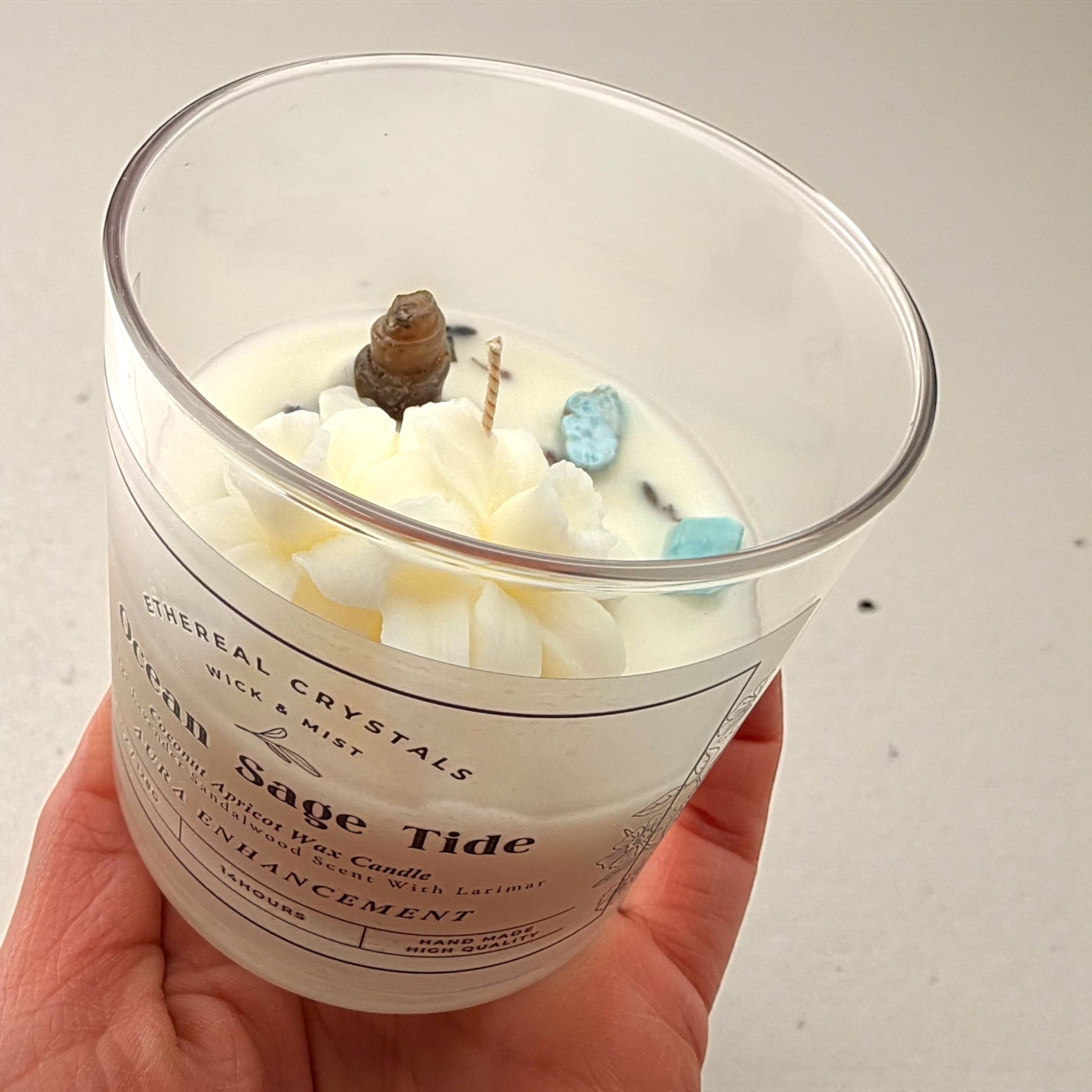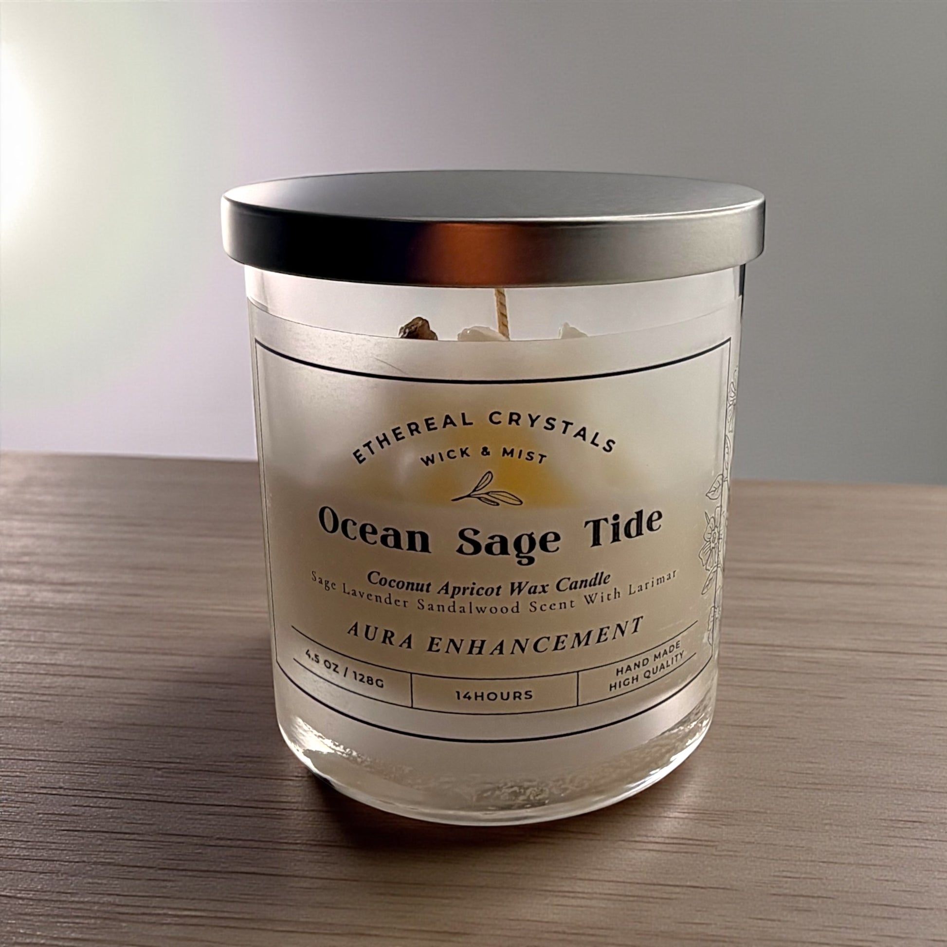 "Ocean Sage Tide" is infused with the soothing energy of Larimar crystal and enriched with a calming blend of sage, lavender, and Indian sandalwood, this candle is designed to cleanse your space and promote tranquility. Let the gentle oceanic energy guide you to deep relaxation, clarity, and serene calm. Embrace the peaceful stillness of the sea and invite a sense of balance and renewal into your life.