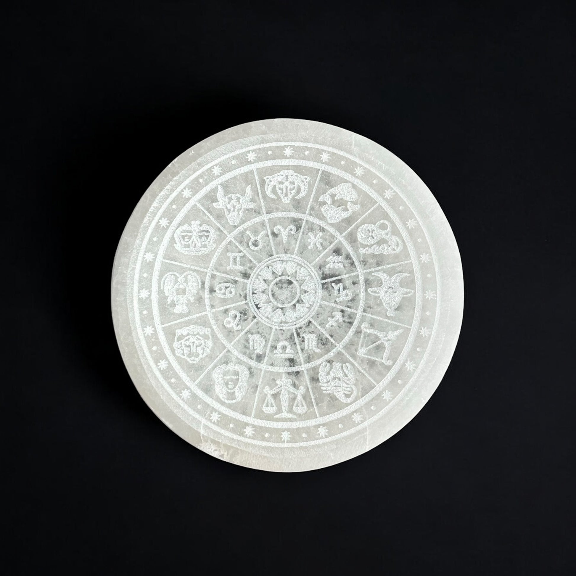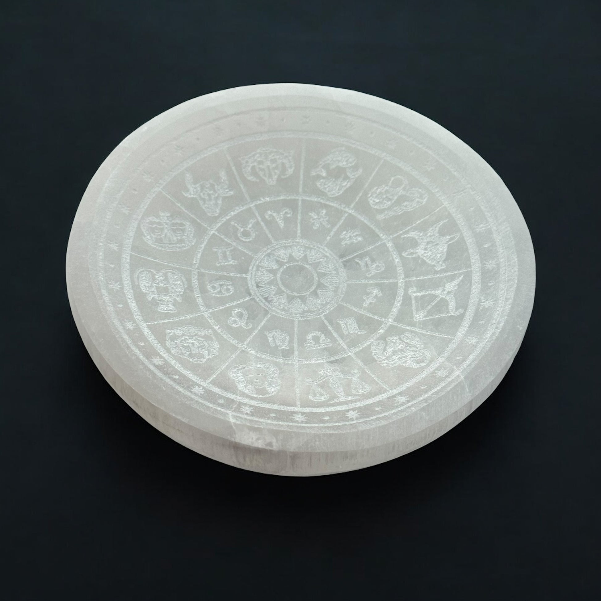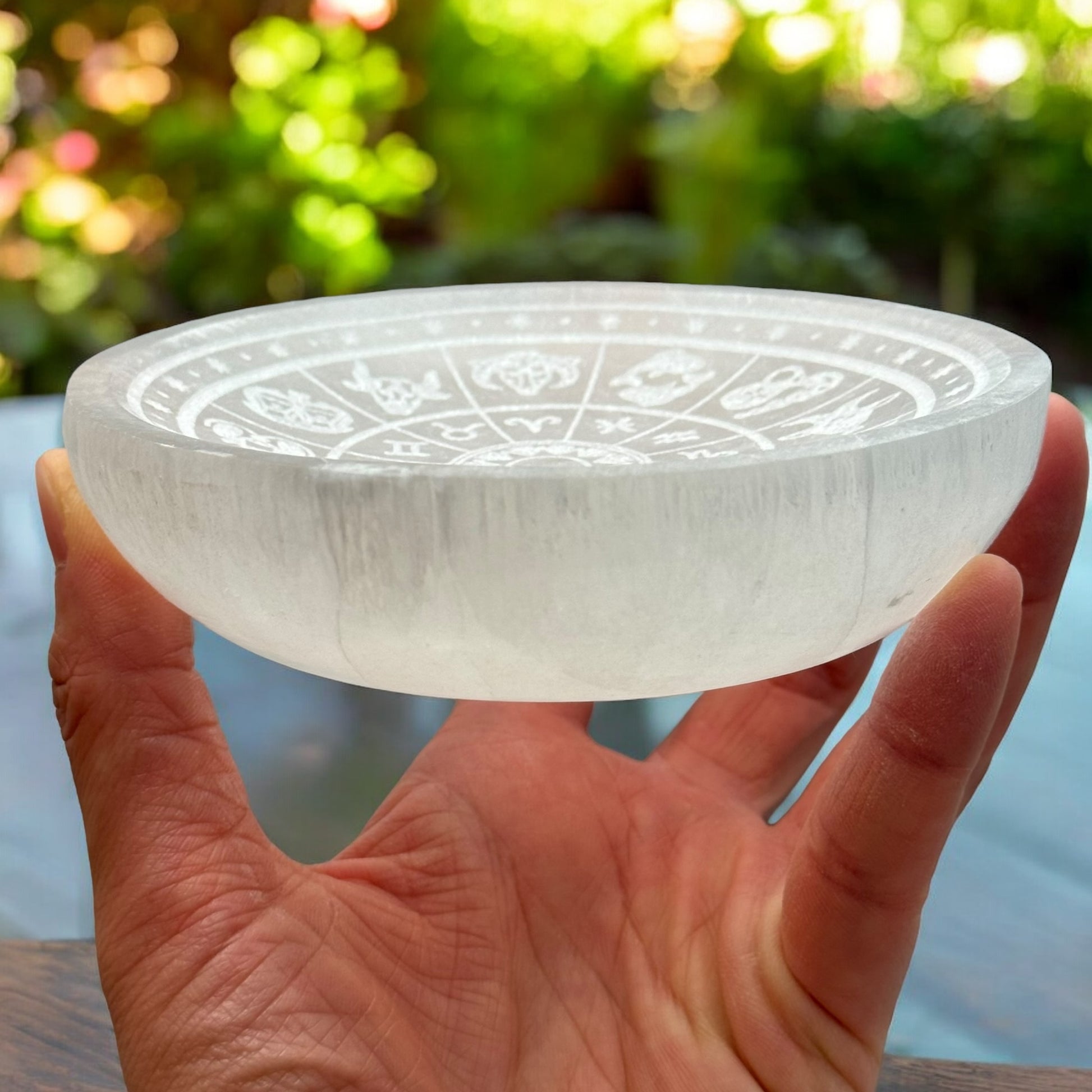 Selenite Bowl, Round, White, With Horoscope Carving Details