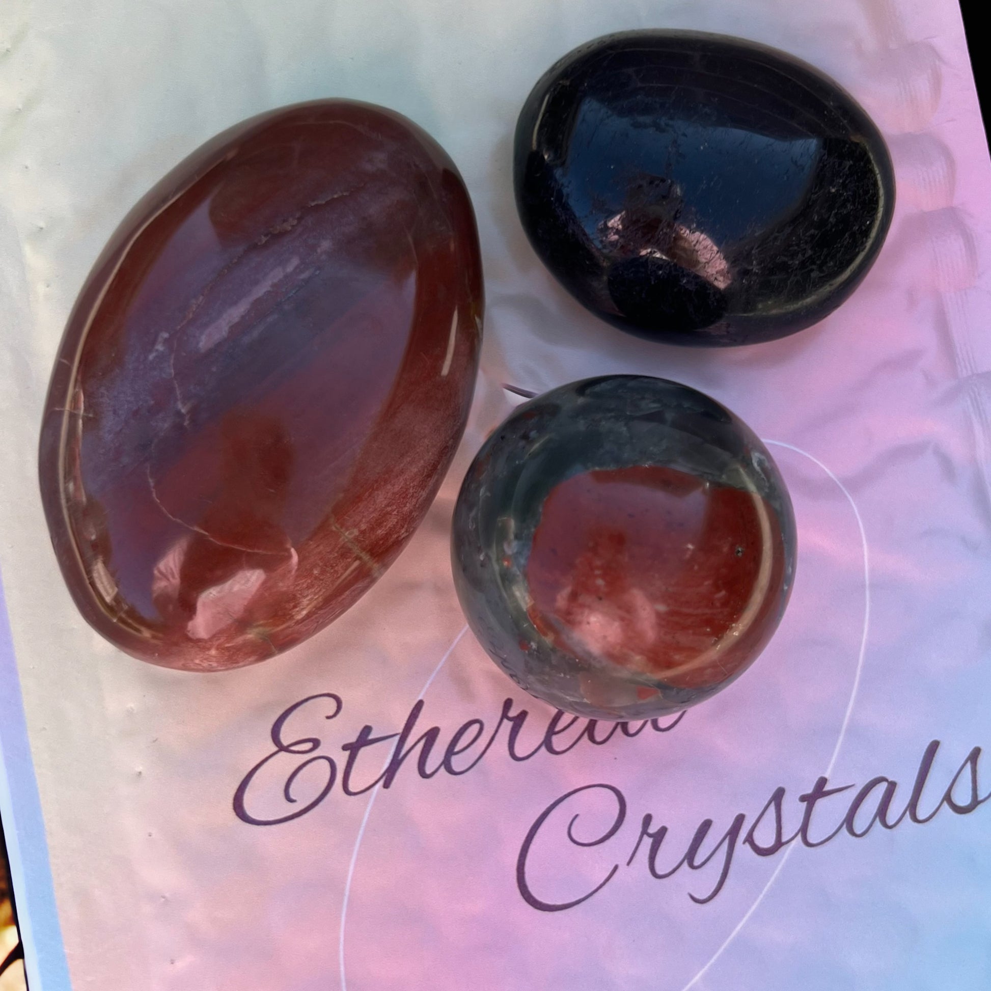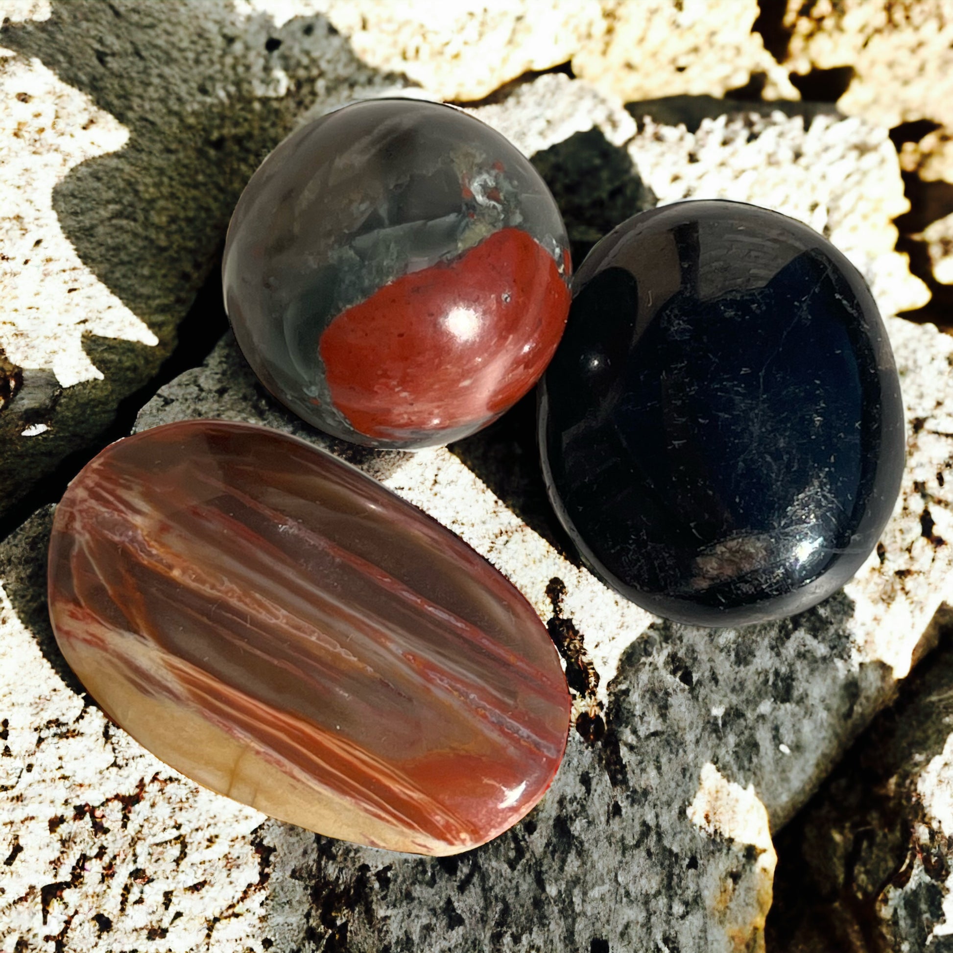 Kit includes: Black Tourmaline Palm Stone, Mini Blood Stone Sphere, Petrified Wood Palm Stone