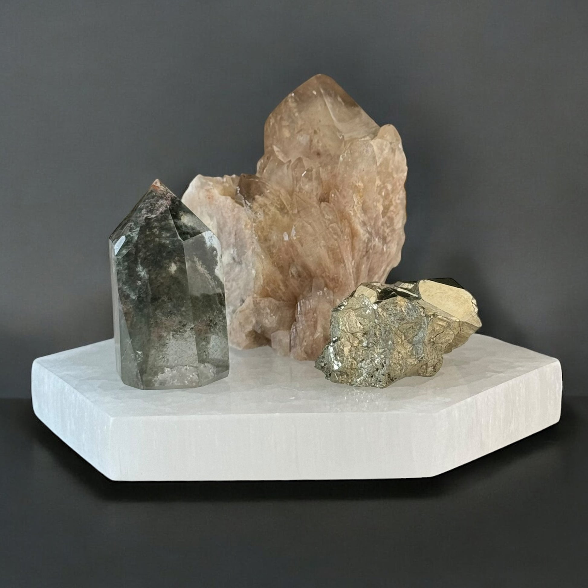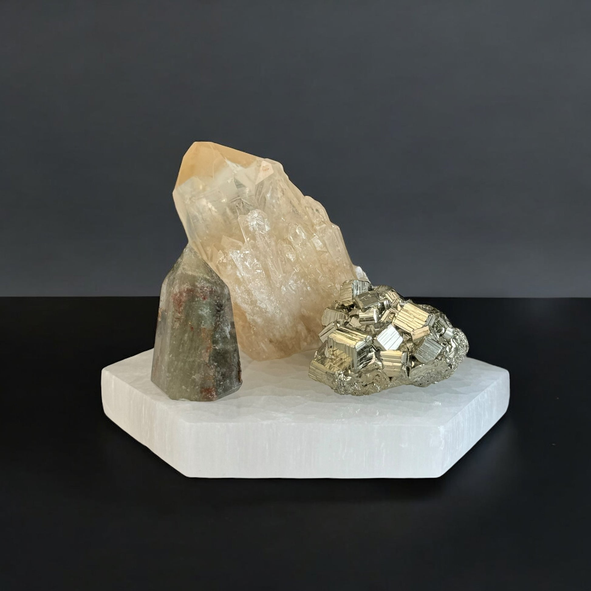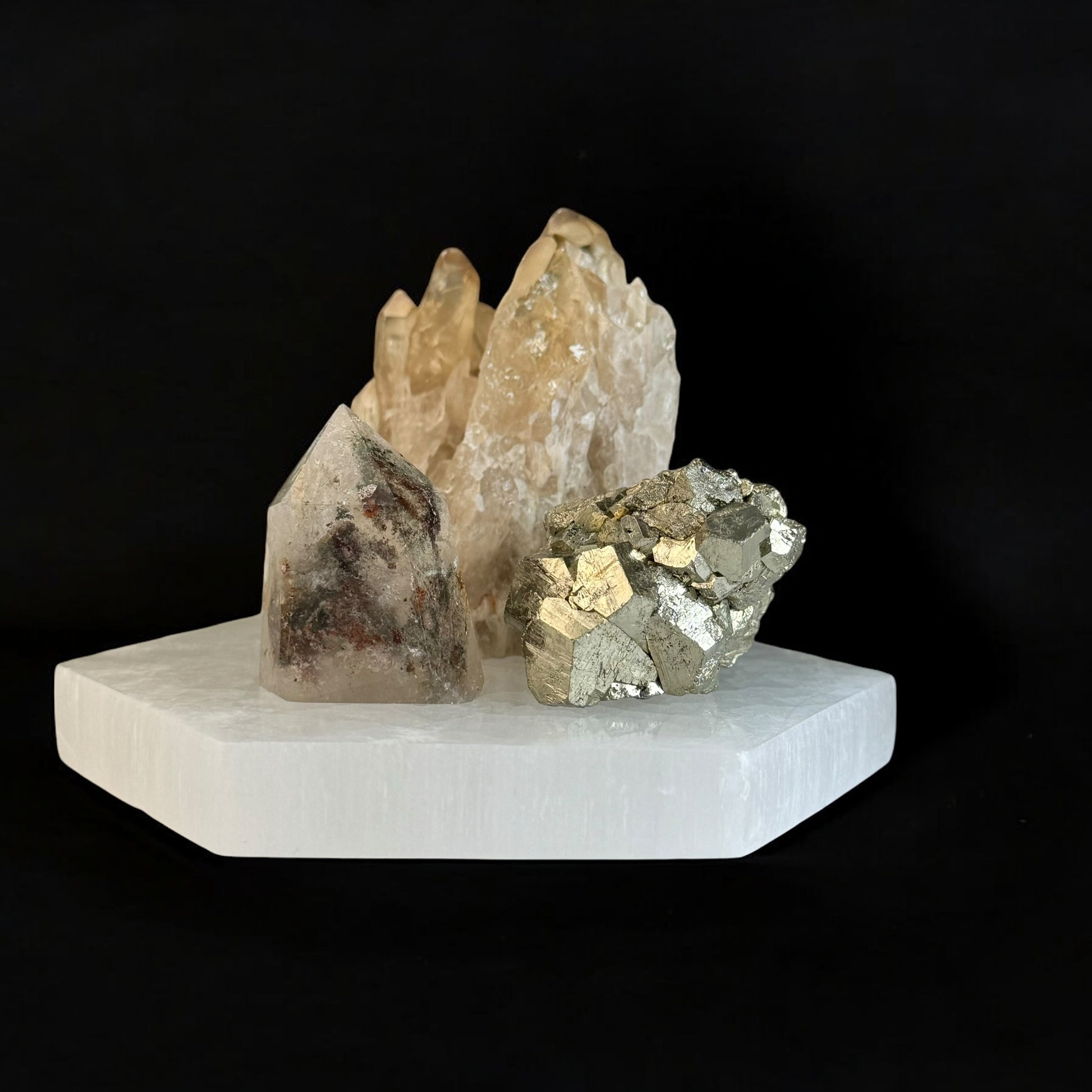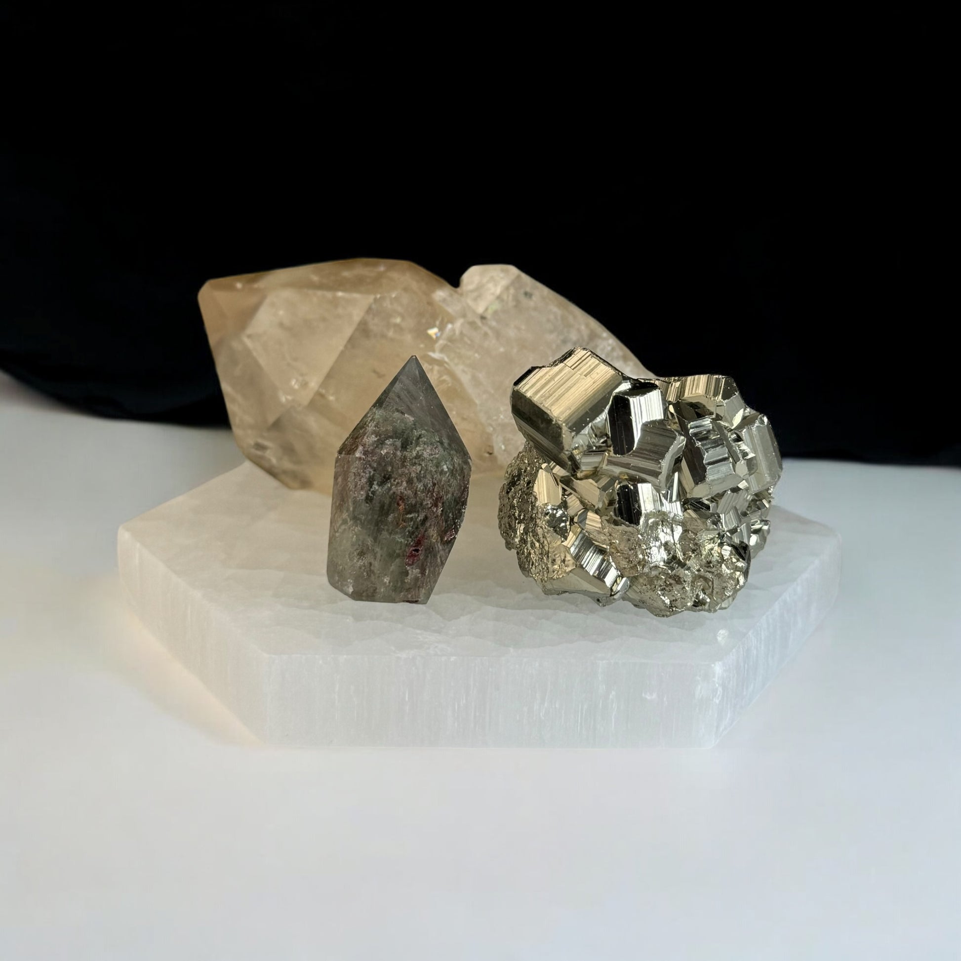 Garden Quartz Point grounds the set by providing a stabilizing energy that promotes clarity and balance. This grounding effect helps you connect to your higher purpose and stay focused on long-term goals rather than short-term gains. It also amplifies the manifestation energies of Kundalini Citrine and the protective qualities of Pyrite.