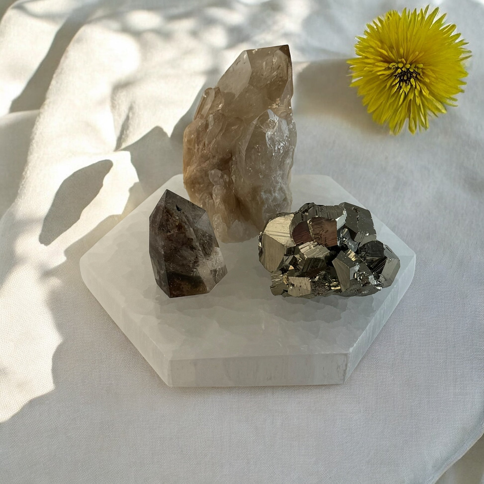 Selenite Plate serves as the energetic amplifier and purifier of the set, continuously cleansing and recharging each crystal so they can work at their highest potential. Selenite clears any lingering negativity, allowing Kundalini Citrine, Pyrite, and Garden Quartz to resonate more purely, enhancing the flow of abundance and wisdom into your life.