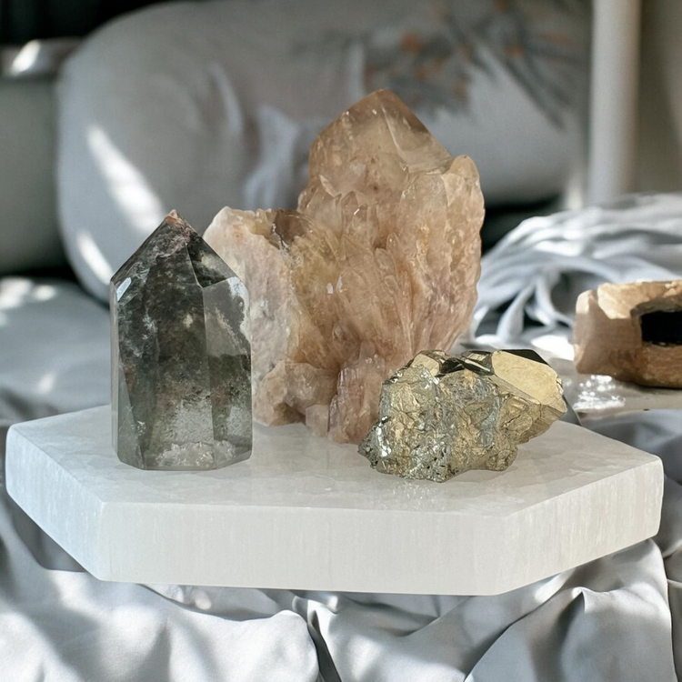 這款 4 件水晶套裝是一份有意義的節日禮物,經過精心設計,可支持各種治療意圖,如繁榮、保護、深度睡眠和情感治療等。每套都包含三顆精心挑選的水晶,它們可和諧地用於特定目的,並搭配拋光的亞硒酸鹽板來淨化和增強其能量。