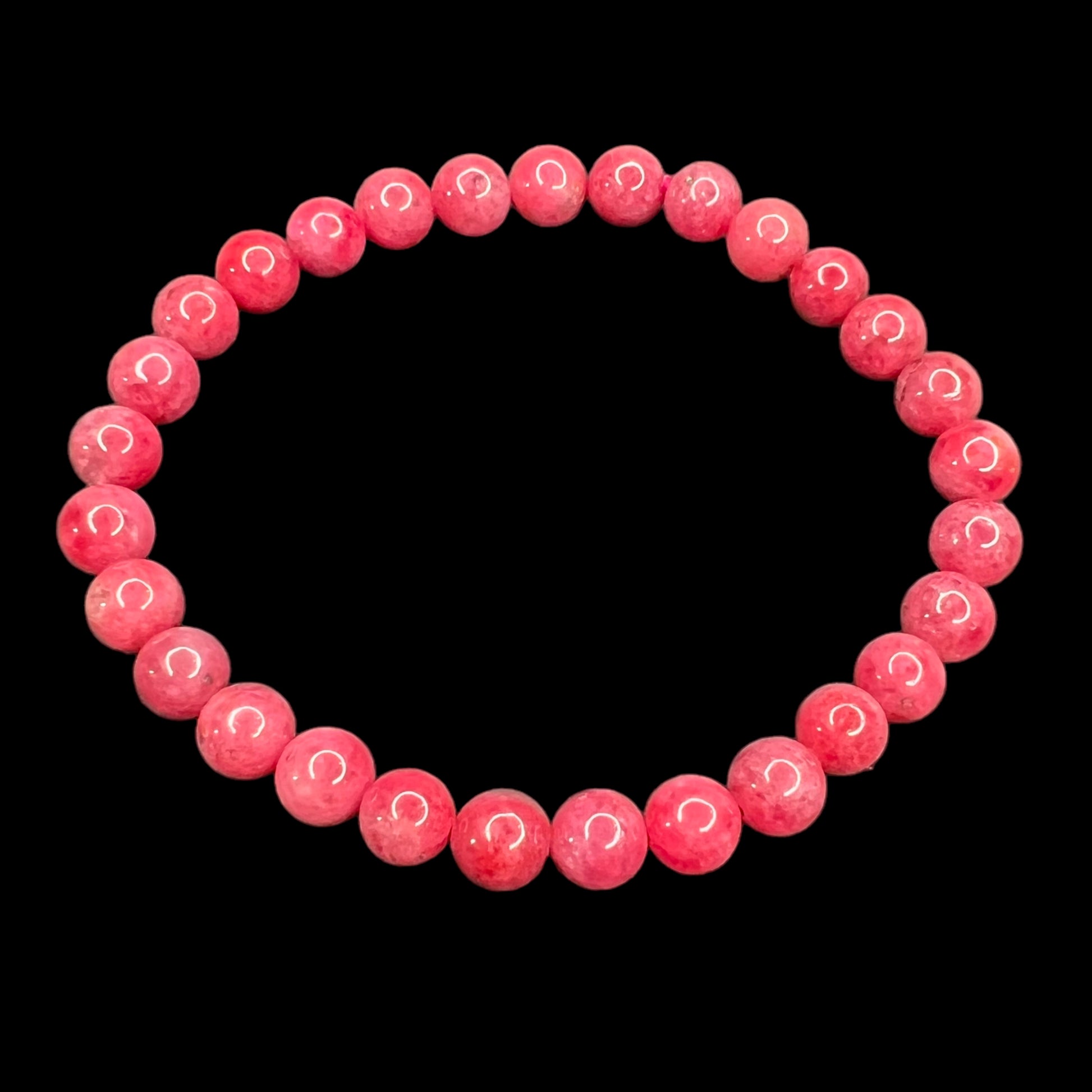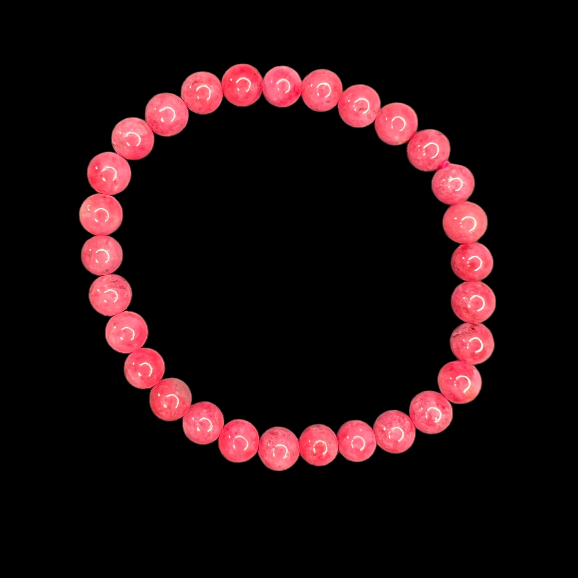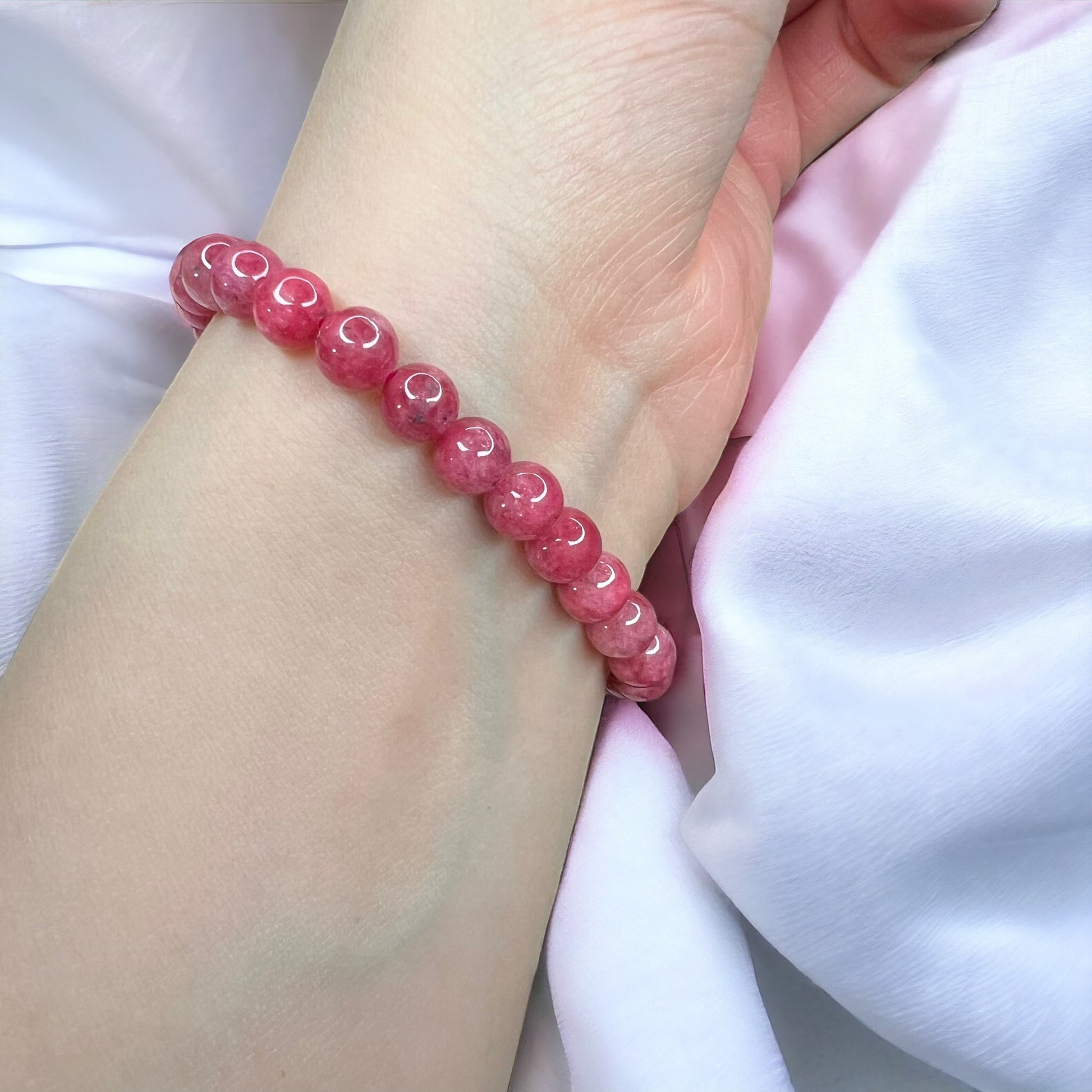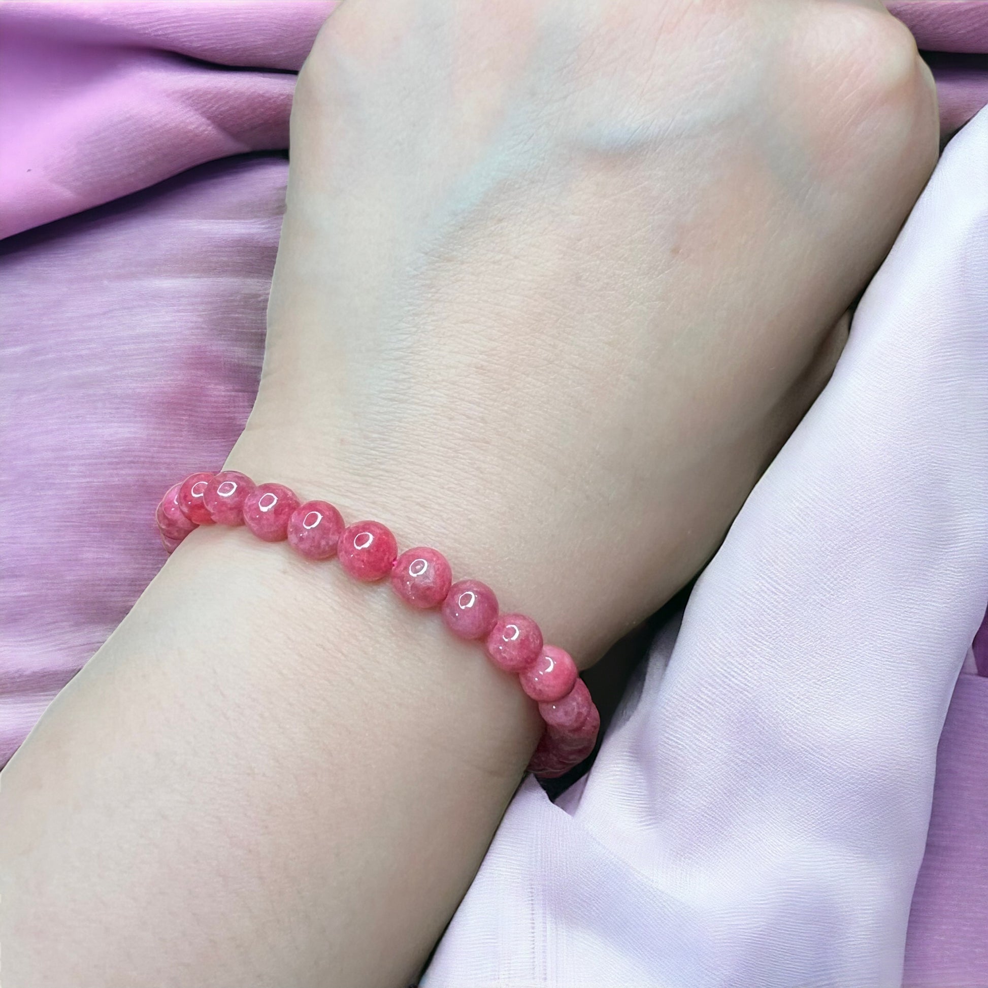 薔薇輝石是一種獨特的寶石,以其濃鬱的粉紅色至紅色色調而聞名,通常含有黑色錳內含物。當作為手鐲佩戴時,人們相信它具有多種治療功效。以下是薔薇輝石手鍊的一些常見治療功效: