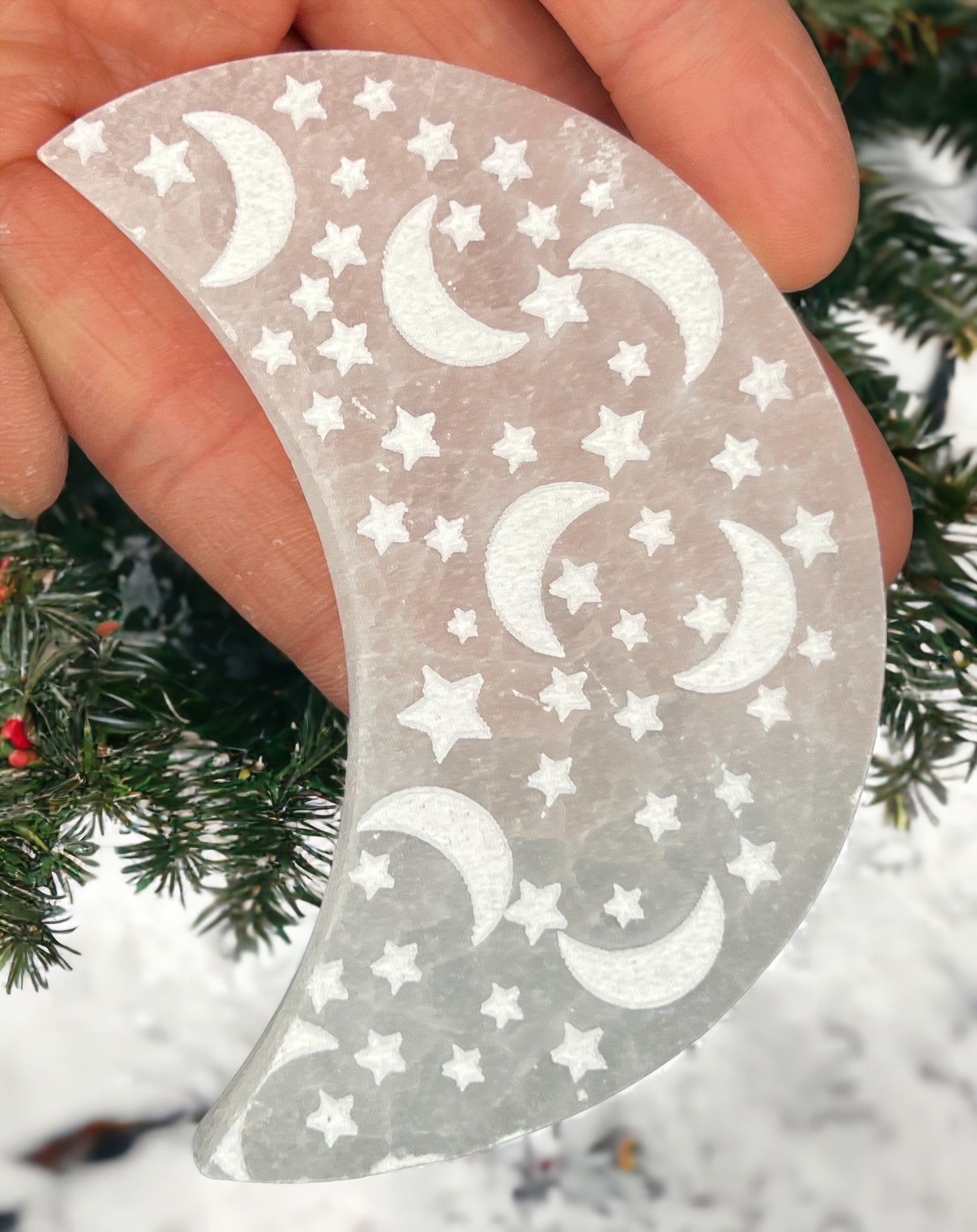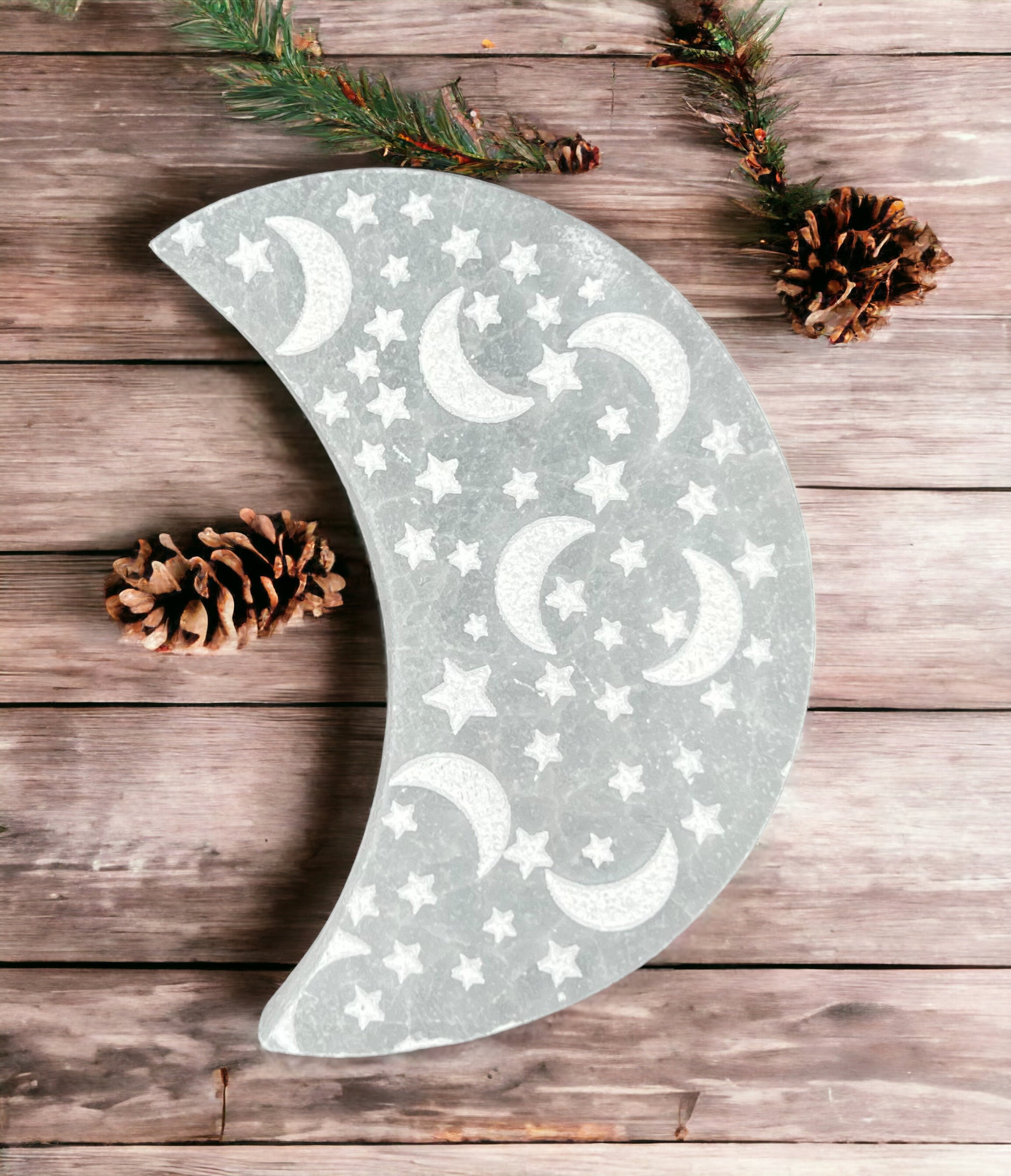 透石膏月盤,月亮形狀,盤子,白色,帶月亮和星星雕刻細節